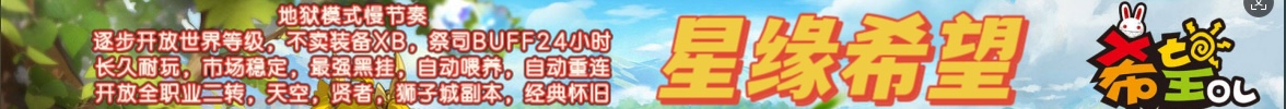 | 星缘希望 | 公测 | 星缘希望,地狱模式慢节奏,目前世界等级最高130级,不卖装备XB,祭司BUFF24小时,长久耐玩,市场稳定,最强黑挂,自动喂养,自动重连,后面开放全职业二转,天空,贤者,狮子城副本,经典怀旧 |